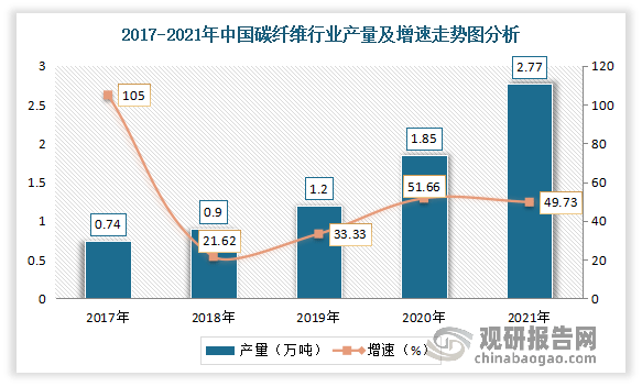 隨著碳纖維企業(yè)整體技術(shù)水平正在不斷提升,產(chǎn)能利用率呈現(xiàn)出不斷增長(zhǎng)的趨勢(shì)。2017-2021年我國(guó)碳纖維產(chǎn)量不斷增長(zhǎng)。數(shù)據(jù)顯示,2020年我國(guó)碳纖維產(chǎn)量達(dá)1.85萬(wàn)噸,同比增長(zhǎng)51.66%;2021年我國(guó)碳纖維產(chǎn)量達(dá)2.77萬(wàn)噸,同比增長(zhǎng)49.73%。
