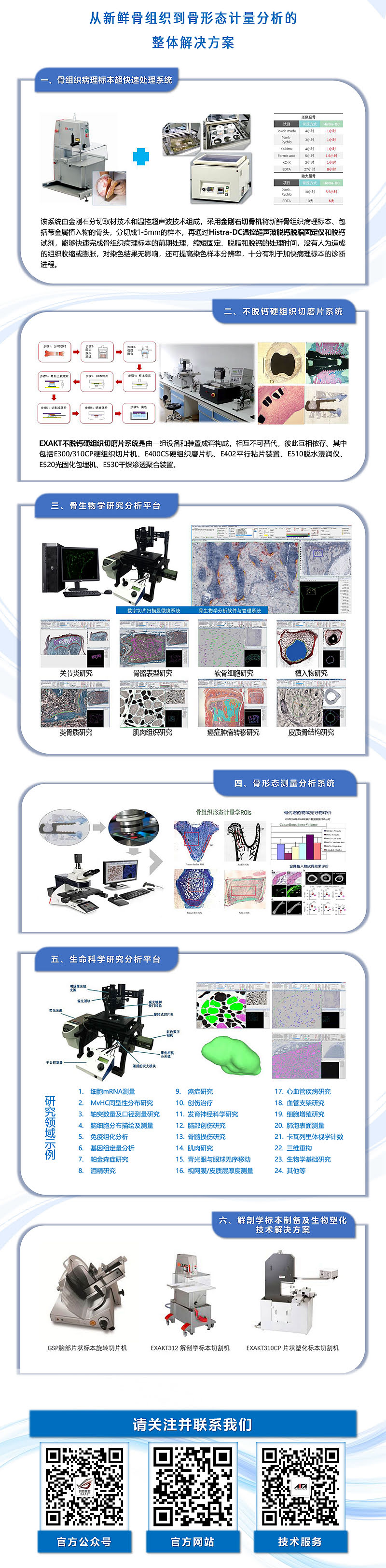 北京共贏國際聯(lián)盟國際科技有限公司在B48展位上,現(xiàn)場展示了:病理病理超快處理系統(tǒng),可以精確、安全、快速地為病理學研究提供組織的前期處理工作; EXAKT生物醫(yī)學硬組織切磨系統(tǒng),是將不能用常規(guī)設(shè)備制備成組織切片的軟硬組織標本制成不脫鈣醫(yī)學組織切片,并保持軟硬組織、組織與植入物之間的原有組織結(jié)構(gòu)形態(tài)。該切磨系統(tǒng)特殊的技術(shù)設(shè)計、技術(shù)配置以及獨特的工藝方法,均與常規(guī)設(shè)備和工藝不同。新鮮的醫(yī)學組織標本經(jīng)過取材固定及脫水處理后,用光固化樹脂浸透、包埋、再行鋸片、磨片、染色等步驟制成厚約 10μm的醫(yī)學組織切片。采用 EXAKT 切磨系統(tǒng)設(shè)備制備的醫(yī)學軟硬組織切磨片在顯微鏡下能夠清楚準確地觀察到組織的微觀結(jié)構(gòu)及其之間的相互關(guān)系。EXAKT切磨系統(tǒng)設(shè)備能為醫(yī)學軟硬組織疾病的科學研究、新材料的生物相容性研究和嵌入物研究以及醫(yī)學院教學等提供可靠的組織學評價依據(jù)。