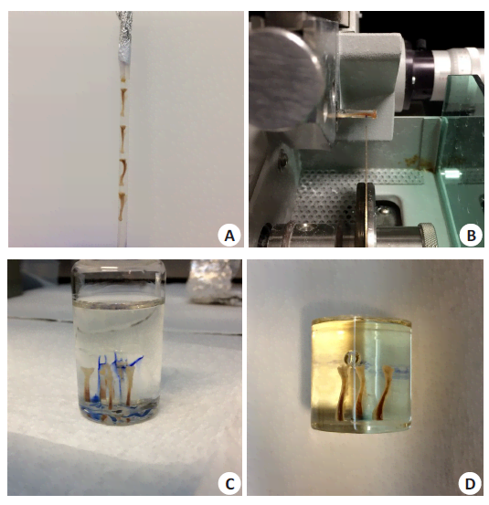 圖2 使用兩次包埋的方式可將多個(gè)脛骨包埋于同一樹脂塊中Fig.2 Multiple tibias embedded in the same block by 2-step embedding. A: Embedding multiple tibias in a flint glass tube; B: Trimmingthe tibia at the 1/4 proximal part; C: Embedding multiple tibias while maintaining the section plane flat; D: Polymerized block withmultiple tibias.