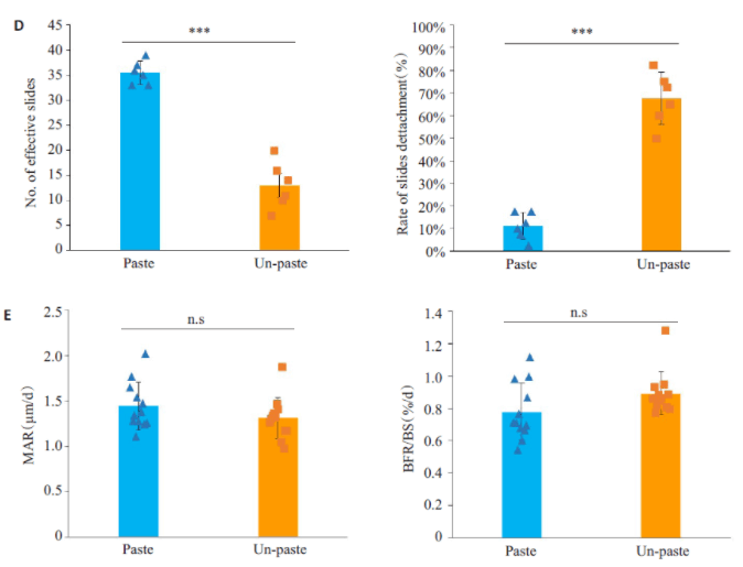 A: Representative scan pictures of Paste and Un-paste slides(scale bar=1 mm); B: Representative unstained paste and non-paste slides under microscope (left panel: scale bar=200 μm; right panel: scale bar=100 μm); C: Representative fluorescent pictures of paste and non-paste slides (left panel: scale bar=100 μm; right panel: scale bar=50 μm); D: Number of effective slides and rate of slides detachment in paste and non-paste groups (***P<0.001, n=6); E: Mineral apposition rate (MAR, μm/d) and bone formation rate (BFR/BS, %/d) in paste and non-paste groups (n.s: P>0.05, n=12).