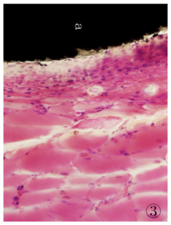 圖3 高倍鏡下埋置有CF/PEEK 復(fù)合材料的肌肉組織病理切片:a.試驗樣品CF/PEEK復(fù)合材料; b.肌肉組織