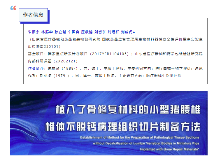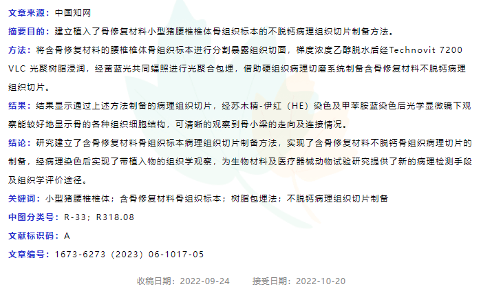 用于骨修復(fù)的生物材料及器械在進(jìn)行臨床試驗(yàn)前均需要進(jìn)行臨床前安全性和有效性動(dòng)物試驗(yàn)研究,以預(yù)測(cè)其應(yīng)用于臨床可能發(fā)生的不良作用[1,2]。骨修復(fù)材料的動(dòng)物試驗(yàn)研究需要制備合適的骨缺損動(dòng)物模型,將骨修復(fù)材料植入到制備的骨缺損區(qū)域,評(píng)價(jià)骨缺損部位的局部炎癥反應(yīng)、骨整合程度、骨重建情況,對(duì)該骨修復(fù)材料的安全性及有效性進(jìn)行評(píng)價(jià)[3,4]。生物材料及醫(yī)療器械動(dòng)物試驗(yàn)周期結(jié)束后,需要剖檢、取樣,切取連帶植入物及其周邊骨組織進(jìn)行病理組織切片制備,以觀察生物材料及醫(yī)療器械與宿主骨組織結(jié)合界面的結(jié)合情況及其在動(dòng)物體內(nèi)的吸收降解情況。與普通的石蠟包埋組織切片制備方法相比,埋置有植入物的骨組織標(biāo)本進(jìn)行組織切片制備時(shí)采用樹(shù)脂包埋病理組織切片制備方法不需要進(jìn)行脫鈣處理,不需要額外剔除組織內(nèi)埋置的植入物,可完整的觀察到植入物與宿主骨組織結(jié)合界面的組織反應(yīng)情況,實(shí)現(xiàn)對(duì)植入物與骨組織結(jié)合界面組織細(xì)胞學(xué)變化的研究。本研究對(duì)植入了骨修復(fù)材料小型豬腰椎椎體不脫鈣病理組織切片制備方法進(jìn)行了研究,以期能為相關(guān)研究人員提供參考。