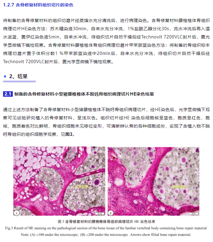 本研究制備的含骨修復(fù)材料腰椎椎體不脫鈣病理組織切片,光學(xué)顯微鏡下可清晰觀察骨缺損部位植入骨修復(fù)材料后組織結(jié)合界面骨的各種組織細(xì)胞結(jié)構(gòu),可進(jìn)行骨缺損修復(fù)后骨組織重建進(jìn)程及炎癥反應(yīng)研究,適用于生物材料及醫(yī)療器械臨床前動(dòng)物試驗(yàn)安全性評(píng)價(jià)的組織病理學(xué)研究。